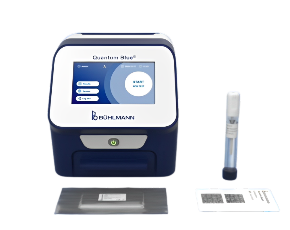 Quantum Blue® is an advanced, compact reader specifically designed for in vitro lateral flow assays. Utilizing a high-precision, camera-based image analysis system, it delivers rapid and reliable quantitative results for fecal calprotectin and therapeutic drug monitoring of biologics (including IFX, ADL, and ADA levels). Ideal for use in near-patient clinical settings, it enables immediate diagnostic and treatment decisions for patients with inflammatory bowel diseases (IBD). The system supports optimized clinical workflows, improved patient care, and provides an indispensable tool for accurate diagnosis and ongoing disease monitoring.
